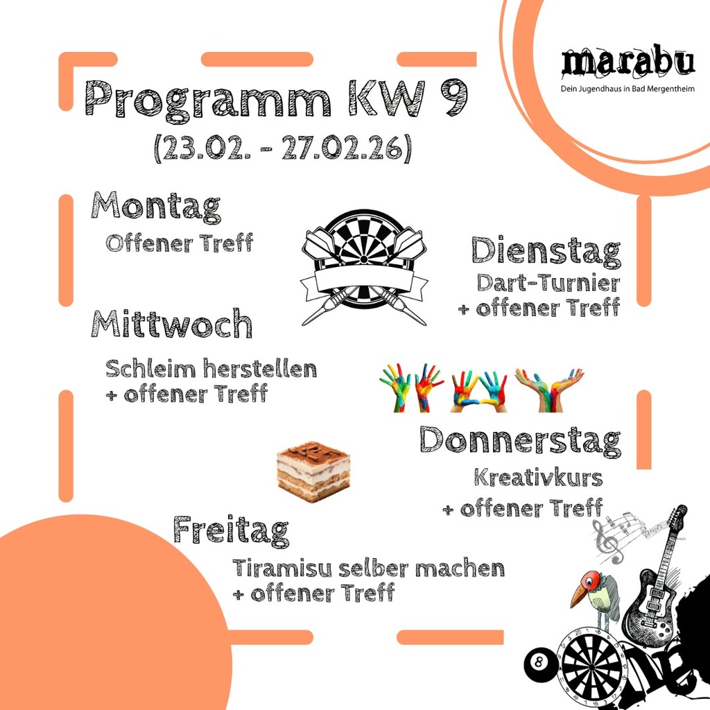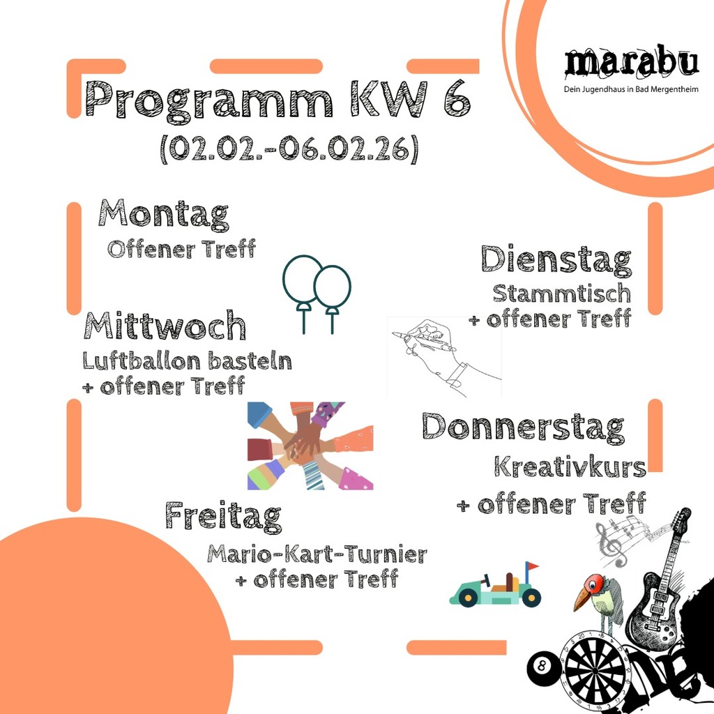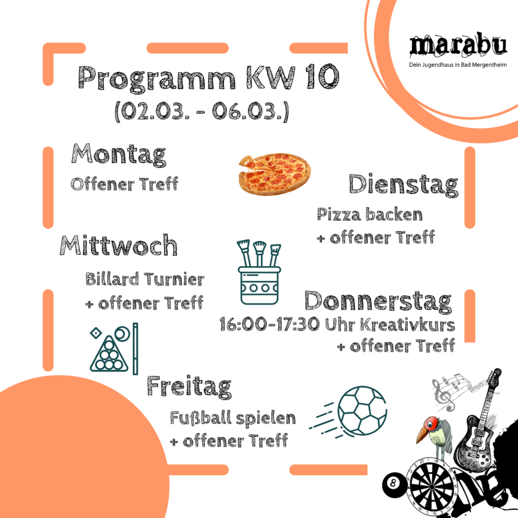 Entdecke unser vielfältiges Programm im Jugendhaus Marabu! Von spannenden Workshops über sportliche Aktivitäten bis hin zu kreativen Projekten ist für jeden etwas dabei. Vergiss nicht, dich für deine Lieblingsaktivitäten anzumelden, bevor die Plätze ausgebucht sind! Komm vorbei und erlebe mit uns unvergessliche Momente!