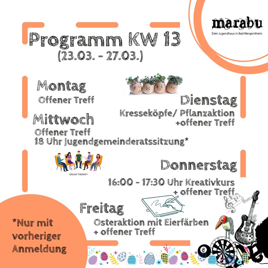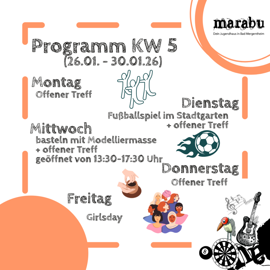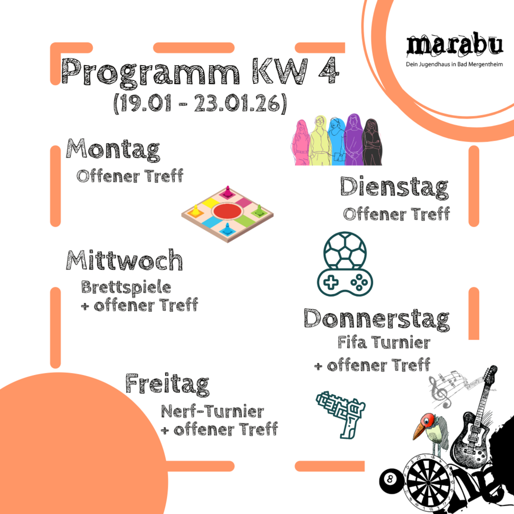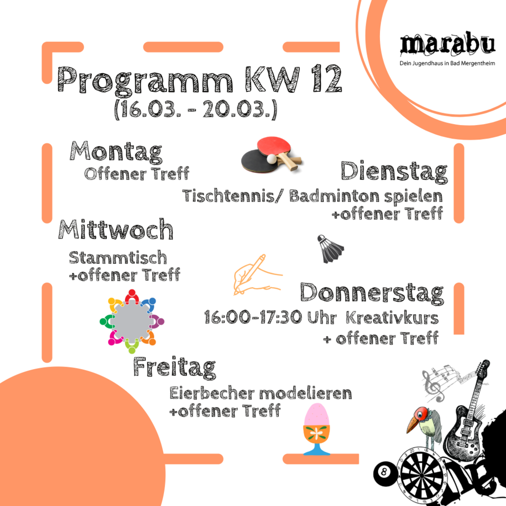 Entdecke unser vielfältiges Programm im Jugendhaus Marabu! Von spannenden Workshops über sportliche Aktivitäten bis hin zu kreativen Projekten ist für jeden etwas dabei. Vergiss nicht, dich für deine Lieblingsaktivitäten anzumelden, bevor die Plätze ausgebucht sind! Komm vorbei und erlebe mit uns unvergessliche Momente!