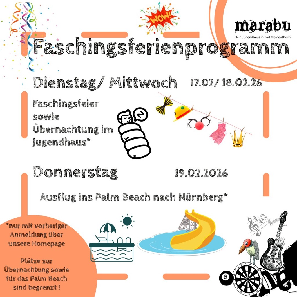 Die Ferien stehen vor der Tür und im Jugendhaus Marabu haben wir ein abwechslungsreiches Programm für euch zusammengestellt! Von spannenden Workshops über sportliche Aktivitäten bis hin zu kreativen Projekten - bei uns ist für jeden etwas dabei. Damit ihr keine unserer tollen Veranstaltungen verpasst, bitten wir euch, eure Kinder rechtzeitig anzumelden. Füllt dazu einfach das beiliegende Anmeldeformular aus und schickt es an uns zurück.
